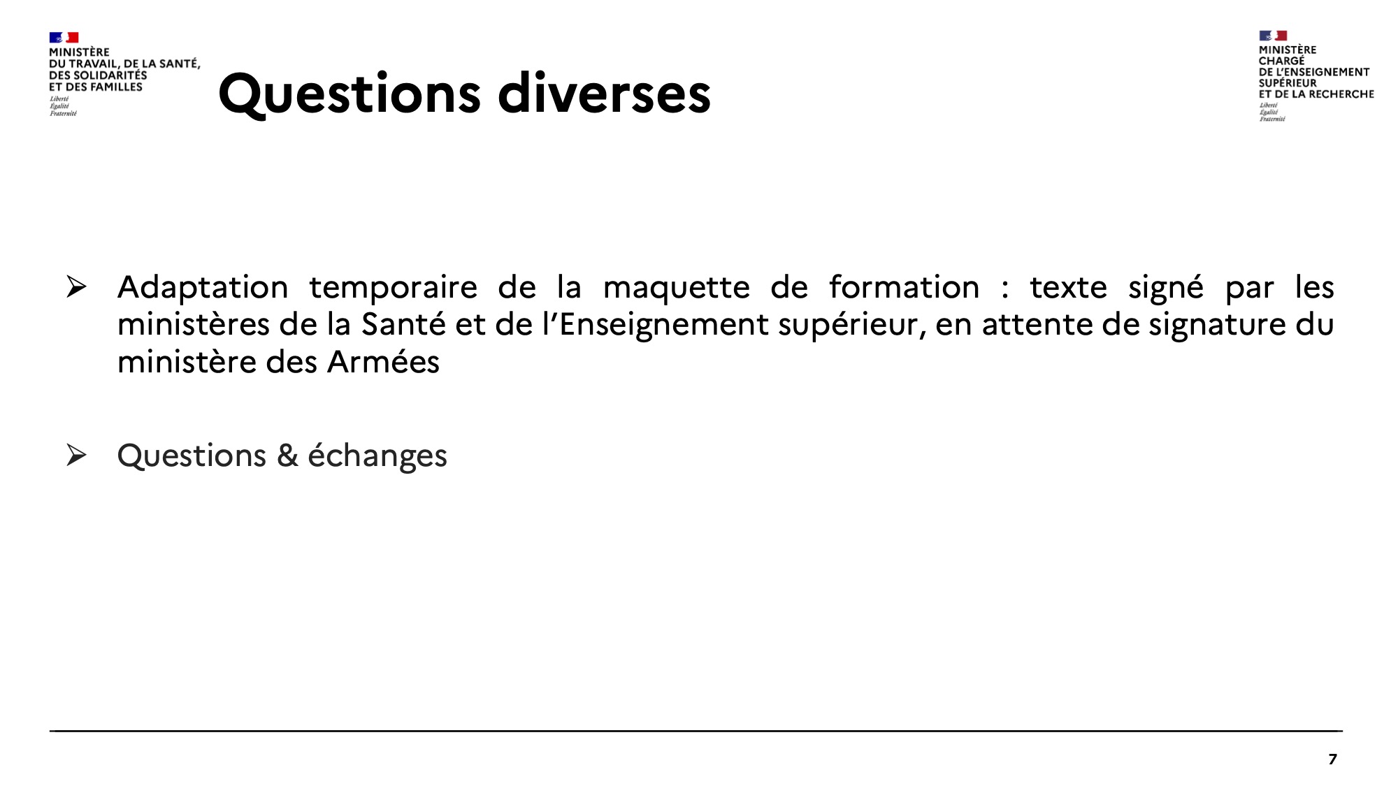 - La FMF attend toujours la publication rapide des textes réglementaires (soutenance de thèse, indemnisation PMSU, rémunération DJ) ainsi que des précisions concrètes sur les circuits financiers.