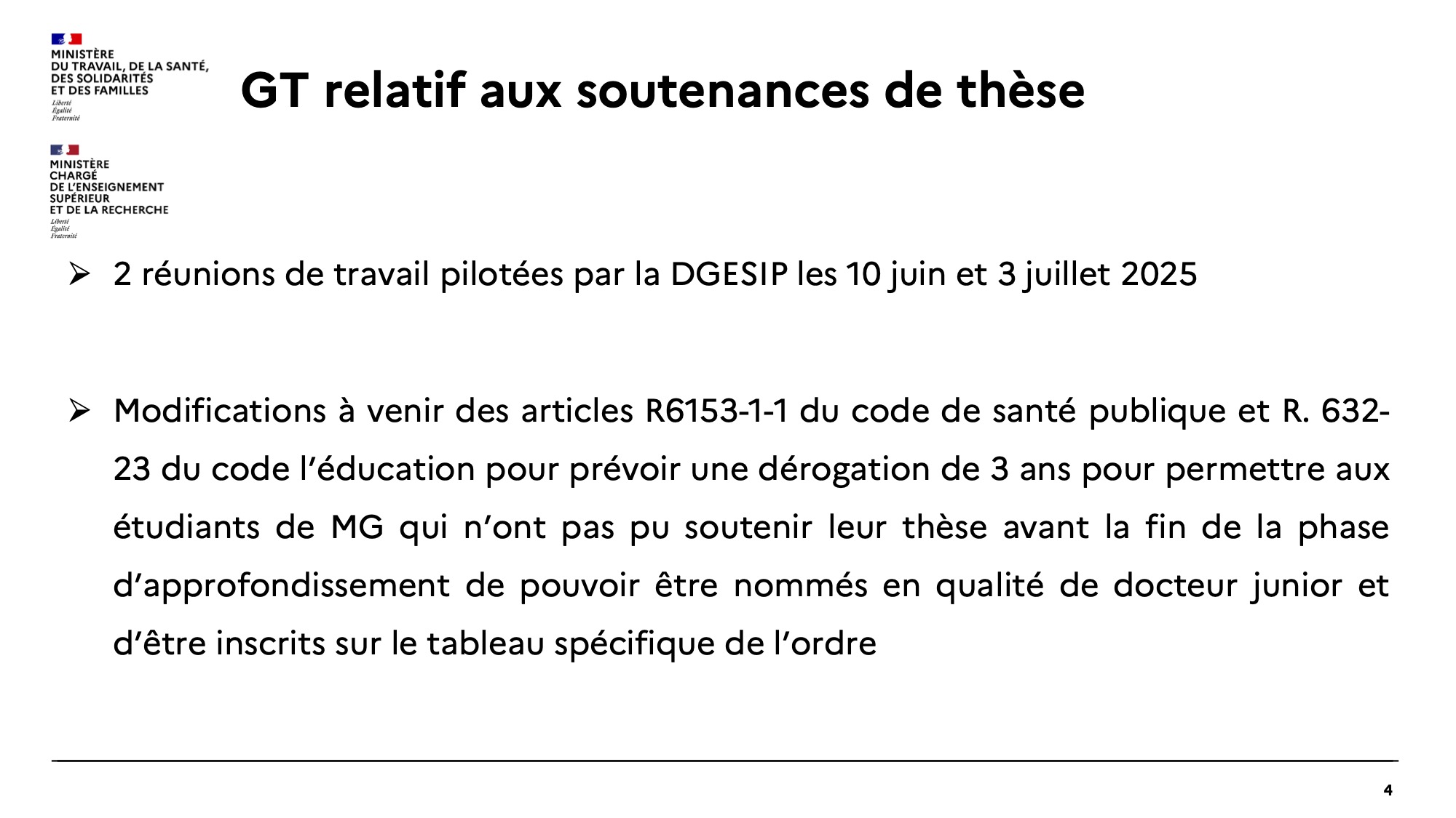 Le CNOM a alerté sur les difficultés que cela posera pour l’inscription ordinale des internes non-thésés, et a proposé que les entretiens d’inscription puissent être organisés localement, au niveau départemental. Le ministère s’est montré ouvert à cette proposition.