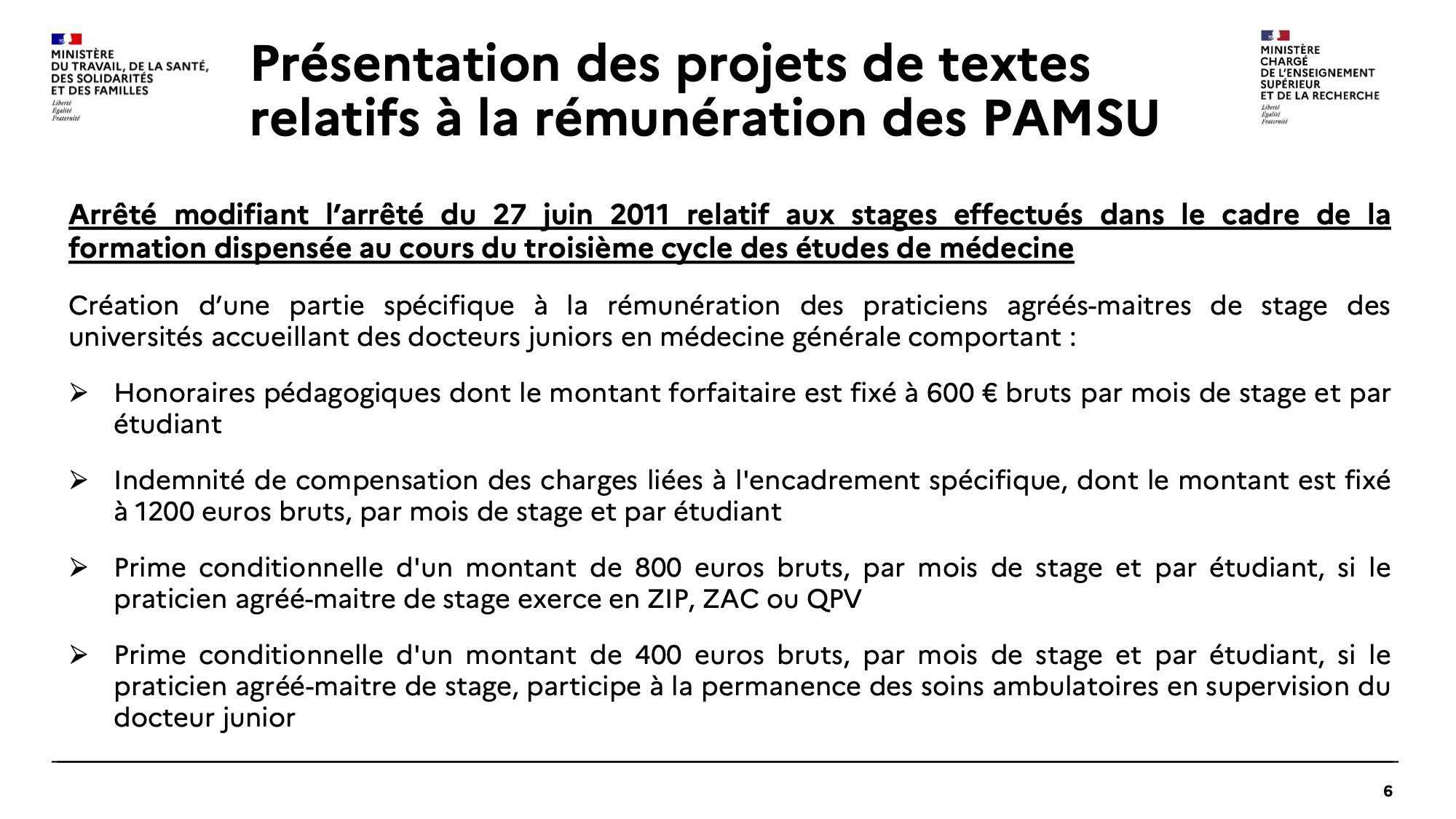 - 400 euros bruts, par mois de stage et par étudiant, si le praticien agréé-maitre de stage des universités, participe à la supervision du docteur junior dans le cadre de la permanence des soins ambulatoires. Sans tenir aucunement compte des difficultés relevées par tous les professionnels lors de la réunion du 24 juillet sur la PDSA.