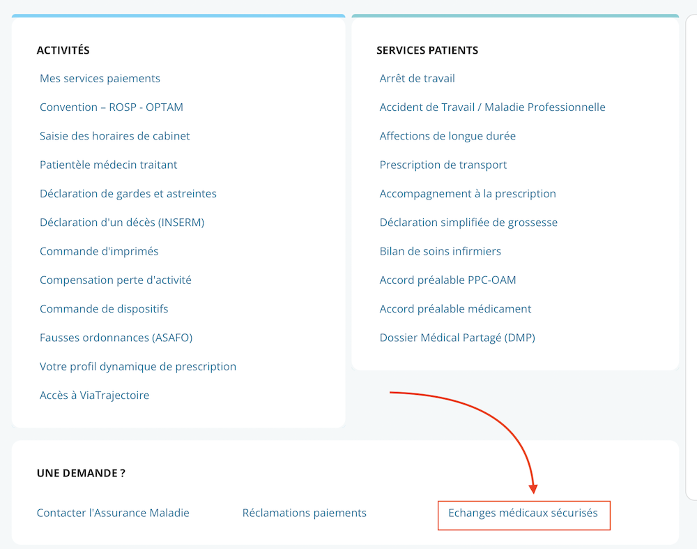 Comme vous êtes déjà dans EspacePro pour rédiger cet arrêt, une fois le patient identifié, il suffit d’aller cliquer sur Echanges Médicaux Sécurisés :