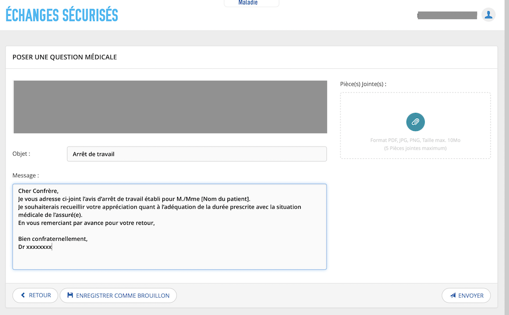 Il ne reste plus qu’à joindre le PDF de l’arrêt (avec un simple glissé-déposé sur la case « Pièces jointes », attention il ne faut pas de caractères accentués dans le nom de la PJ, il ne faut pas demander trop de modernité à l’Assurance Maladie), et à cliquer sur « Envoyer ».