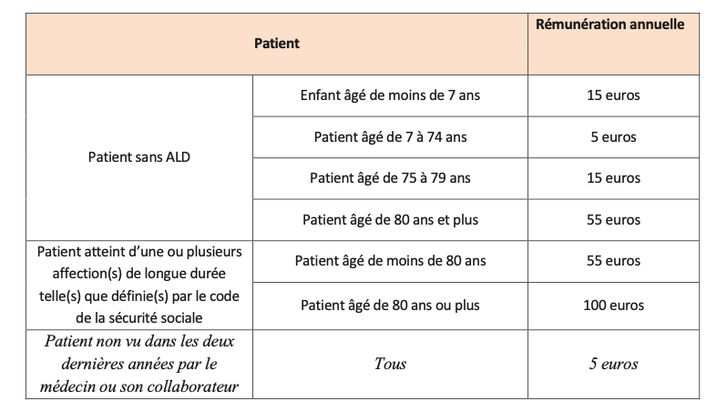 Surtout que s’y rajoute la nouvelle contrainte : patient pas vu pendant 2 ans par le médecin traitant ou un collaborateur libéral (attention les collaborateurs ayant signé un contrat de collaboration avec une société (SEL, SELARL, …) sont exclus du calcul de ce dispositif) = patient rémunéré 5 € quelque soit son statut, et ne permettant pas de majoration C2S ou objectifs de santé publique (voir plus bas). À ce jour personne n’est capable de même estimer quel sera l’impact de cette restriction sur le FMT global.