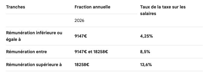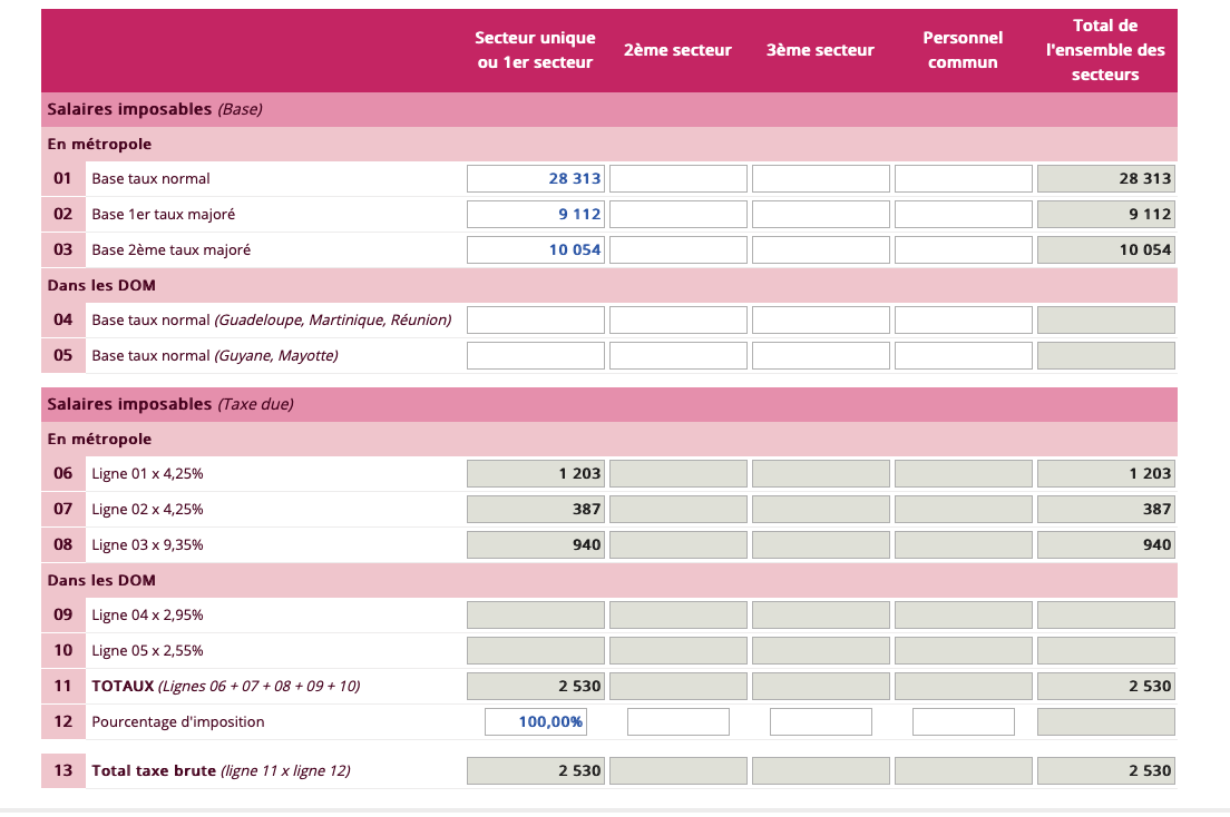 Le taux de 4,25 % (taux normal) est d’abord appliqué sur la totalité de la base imposable correspondant au montant global des rémunérations brutes individuelles versées pendant l’année.