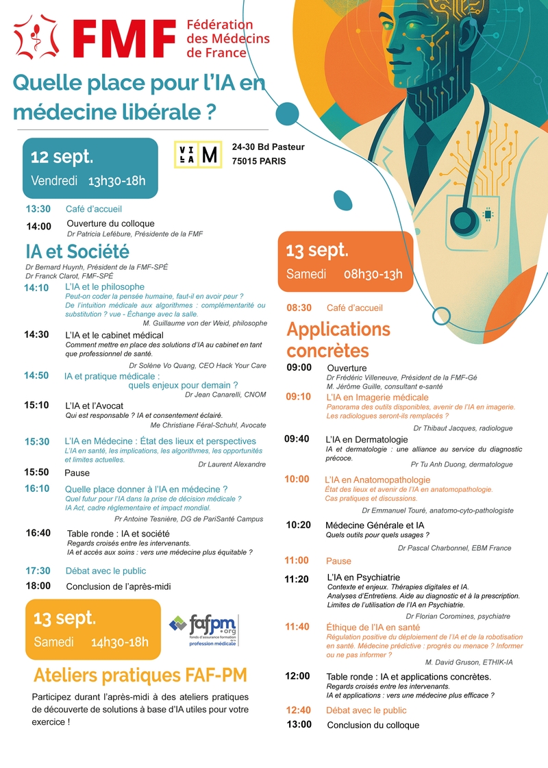 Ce colloque a été conçu par et pour les praticiens, pour offrir un espace de réflexion, d’échanges et de confrontation d’idées autour d’une question centrale : quelle place voulons-nous vraiment donner à l’IA dans notre pratique médicale ?